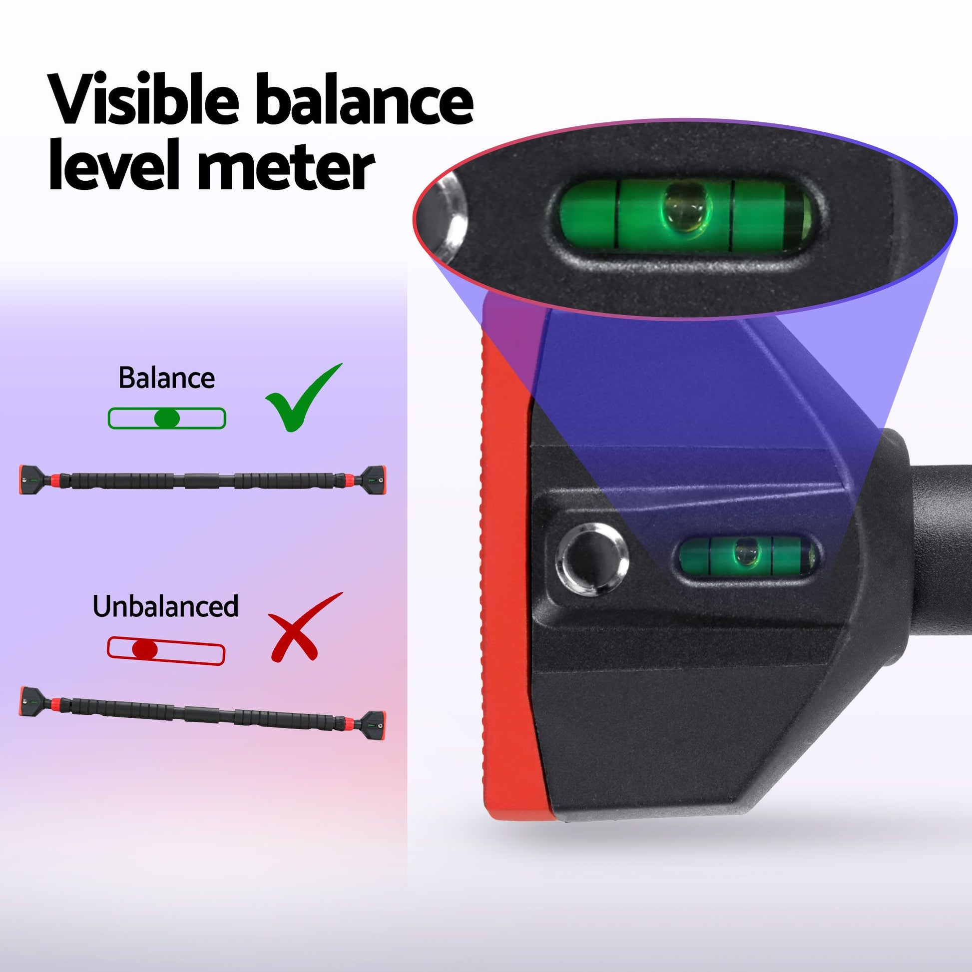 Enjoy flexible, core strengthening exercises anywhere in the home with the Everfit Telescopic Doorway Pull-up Bar. The bar is adjustable to suit hallways between 90 to 125cm in length, making it ideal for most modern doorways. The bar is kept in place with a double safety lock to prevent slippage, and the bar has overall weight-bearing support of 300kg for guaranteed safety and support. A built-in spirit level gives you a visual indicator of whether the bar is straight, making installation easy. Use for a wide variety of exercises including pull-ups, sit-ups, chin-ups and more. Get your fitness journey up and moving with the new Telescopic Pull-up Bar from Everfit.